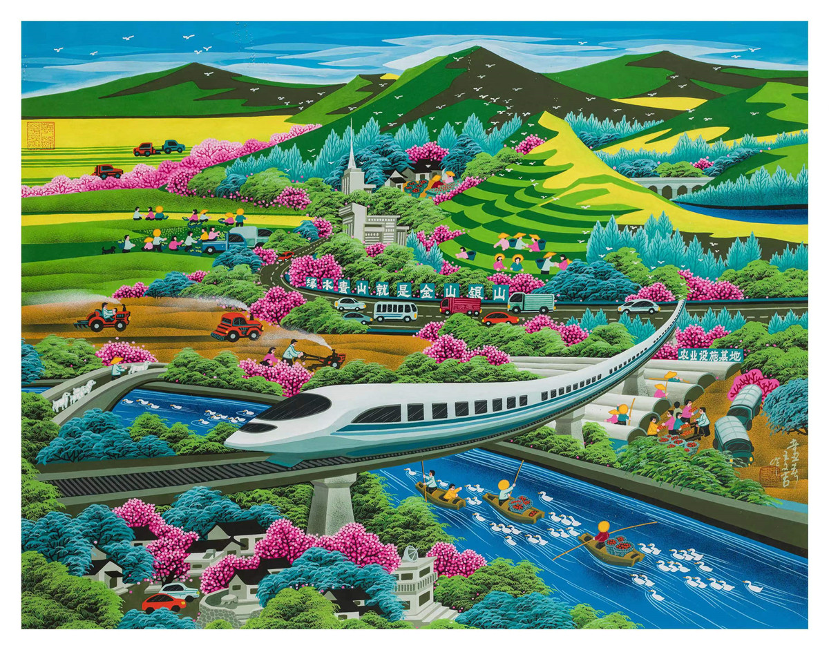 此外,本次展覽中陜西作者王文吉的《青山綠水》引人注目,作者用明媚的色彩描繪新時代山村的綠水青山及人們辛勤勞作的圖景,一輛疾馳而過的動車把古老的鄉村帶進了新時代;云南作者金牛創作的《金秋歡歌》,表現當地民眾通過辛勤的勞動喜獲豐收,不斷走向小康生活的場景;梁茵茵、楊遠聰合作的《扶貧直播振鄉村》,描繪了新時代的鄉村百姓利用高科技手段,通過手機的直播平臺和世界互動推銷農產品,從而走上致富路。