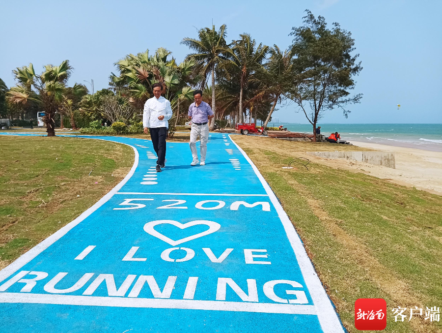 記者在博鰲濱海風情街“海的故事”段看到,一條長1.8公里的健康跑道沿著海南旅游公路瓊海博鰲灣蜿蜒,至媽祖廟前廣場,藍色的跑道上標著各式運動圖案。