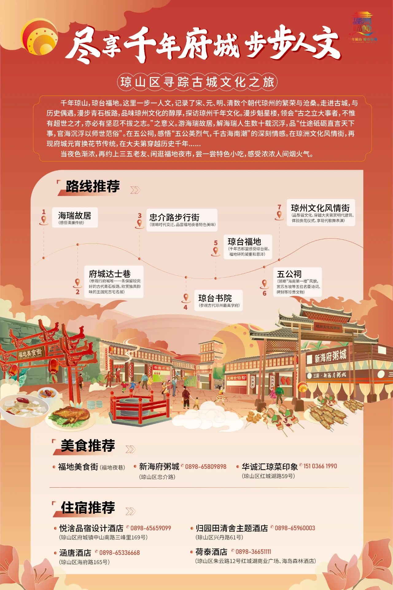 海瑞故居——府城達士巷——忠介路步行街——瓊臺書院——瓊臺福地——五公祠——瓊洲文化風情街
