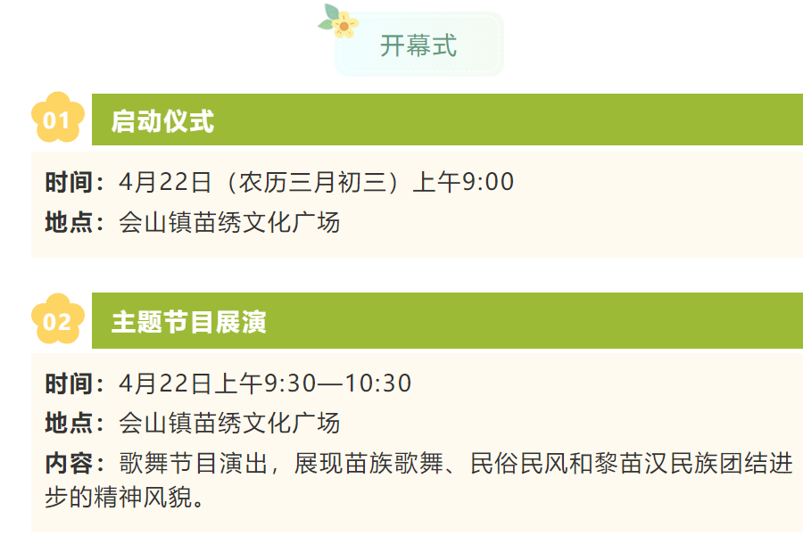 4月20日晚上,活動將首先在會山鎮(zhèn)苗繡文化廣場拉開傳統(tǒng)瓊劇會演,4月21日至22日,將舉行民族文藝表演、文藝晚會以及眾多民間競技活動和男子籃球半決賽、決賽。活動重頭戲開幕式將于4月22日(農(nóng)歷三月初三)上午9點在會山鎮(zhèn)苗繡文化廣場舉行。開幕式后將在現(xiàn)場舉行歌舞節(jié)目演出,展現(xiàn)苗族歌舞、民俗民風和黎苗漢民族團結(jié)進步的主題節(jié)目展演。開幕式當天還將舉行苗族特色美食推介及愛心助農(nóng)大集市,以及黎族苗族特色文化展、苗族文化交流會、政策宣傳活動展等豐富多彩的活動。