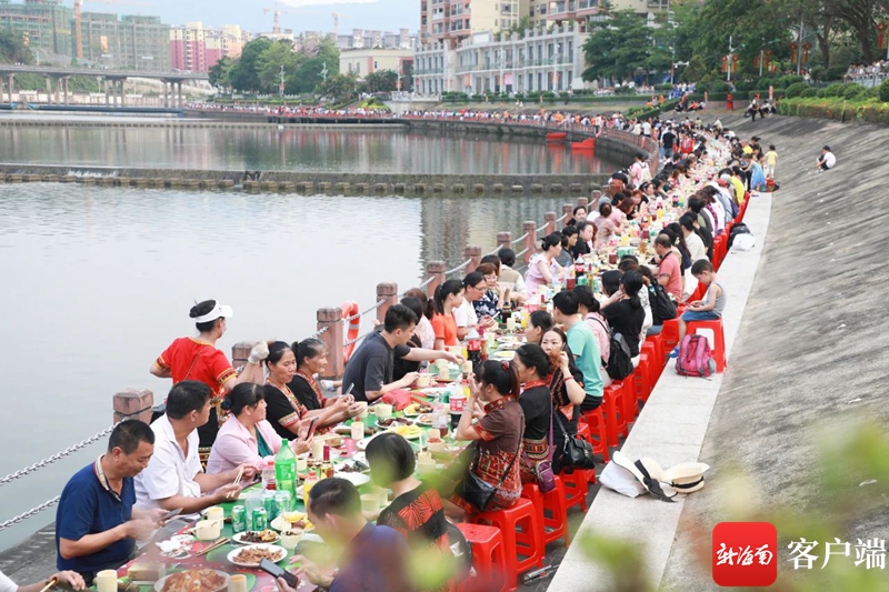 在南叉河兩岸,連綿上千米的宴桌上擺滿了五腳豬、三色飯、竹筒飯、山欄酒等當地特色菜肴,嘉賓游客市民們喝著美酒,吃著美食。席間,身著傳統民族服飾的黎族苗族同胞在舞臺上、人群中載歌載舞,傳頌著古老的民間故事和文化傳統,市民游客和著旋律舉杯高歌,共同演繹出一幅絢麗多彩的民俗畫卷。