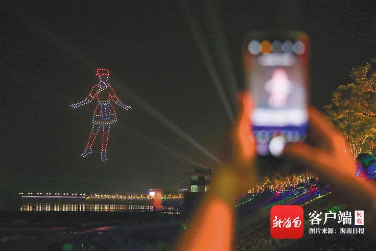 4月21日晚,樂東舉辦無人機展演迎接“三月三”到來。圖為燈光秀展演活動,300架無人機組成苗族姑娘的圖案。海南日報記者 王程龍 攝