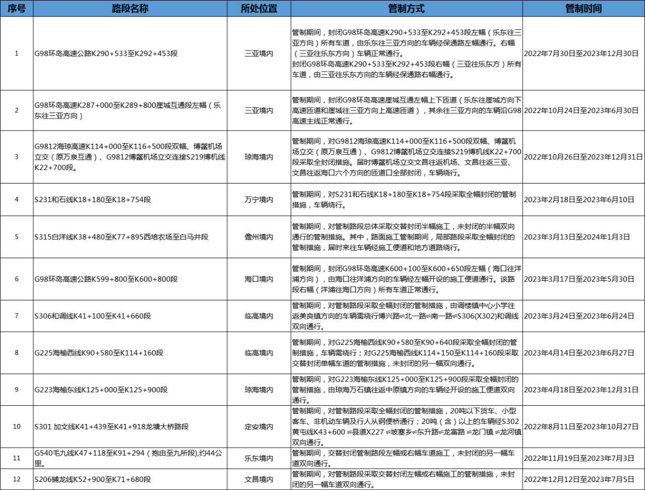 4月29日至5月2日的10時-12時:G98環(huán)島高速東線海口至定安路段(海口往定安方向)、G98環(huán)島高速西線大豐路段(海口往澄邁方向)、G98環(huán)島高速東線萬寧至陵水路段(往三亞方向)、G98環(huán)島高速三亞繞城段(雙向)將處于交通量高鋒時段。