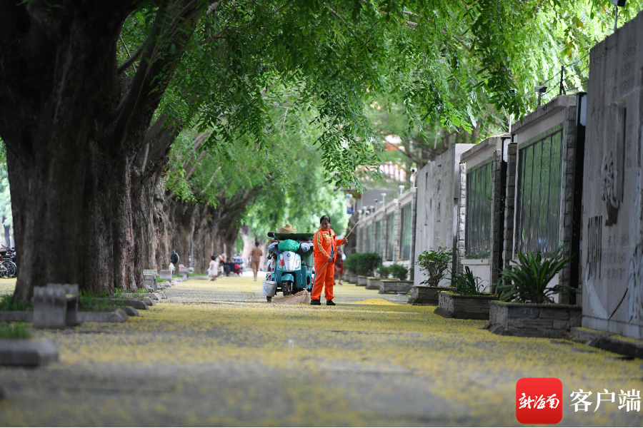 5月,海南三亞,環(huán)衛(wèi)工人在清掃飄落地面的紫檀花。記者 沙曉峰 攝