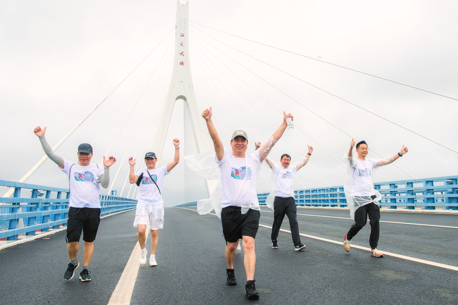 ?5月14日,參加“一醋即發(fā),海來文往”跨海徒步美食行活動的選手們?yōu)楹?邳c贊。海口日報記者 陳長宇 攝