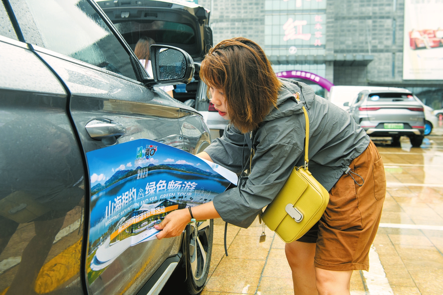 5月13日,“山海相約、綠色暢游”海口百輛新能源車自駕活動啟動,參加活動的車主在往自己的愛車上張貼活動標(biāo)牌。海口日報記者 陳長宇 攝
