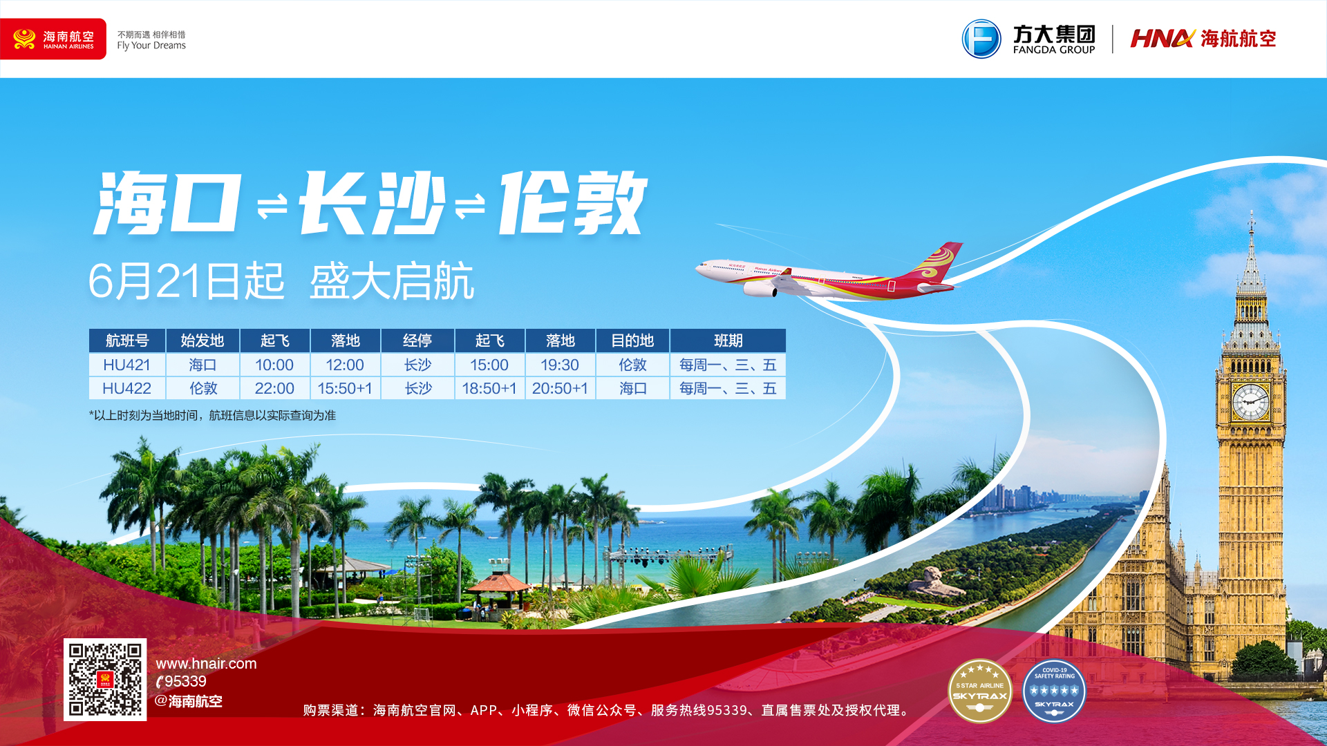 據悉,海南航空長沙?倫敦航線于今年4月7日恢復運營,受到兩地旅客青睞,為進一步滿足旅客出行需要,海南航空將航線改造為海口?長沙?倫敦航線。該航線將于每周一、三、五執行3個往返航班,由波音787夢想客機執飛。去程計劃10:00從海口起飛,12:00到達長沙,15:00從長沙起飛,于當地時間19:30到達倫敦;返程將于當地時間22:00從倫敦出發,次日15:50到達長沙,18:50從長沙出發,20:50到達海口,航班信息請以實際查詢為準。