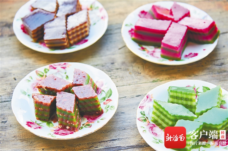 如今,隨著食品加工業(yè)的發(fā)展,許多粉面、小吃都可以在商超里買到,但仍有一些海南人堅(jiān)持純手工“做吃”。每年春節(jié)前夕,文昌市會文鎮(zhèn)鳳會村村民符京和妻子林亞良都會做一批糖貢作為年貨。進(jìn)入臘月后,他們提前準(zhǔn)備糯米、花生、椰絲等原料,用鐵鍋翻炒花生碎、芝麻、糖漿等,然后將半成品裝入正方形的木容器中,壓平切塊。