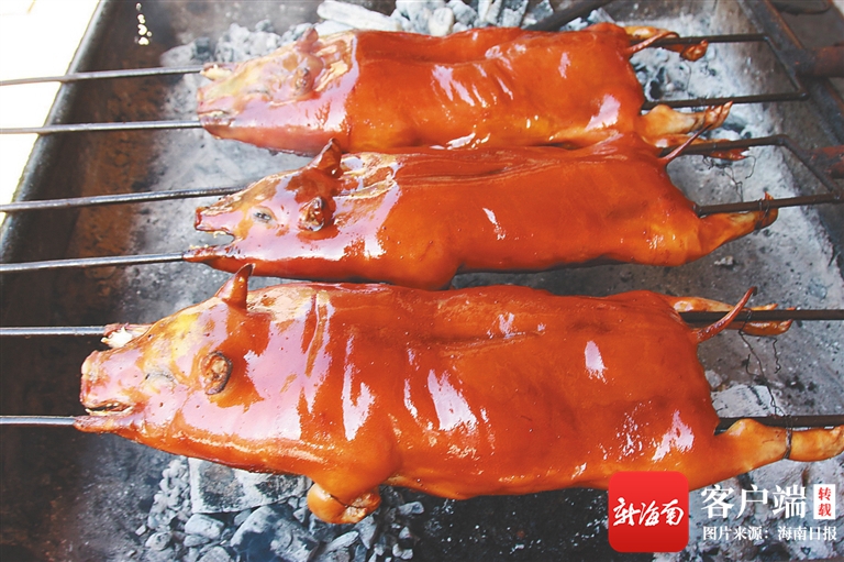 在海南西部的臨高和東方,烤乳豬是一道地方特色菜,不少游客專程前往當地的餐廳吃烤乳豬。餐廳工作人員提前將洗凈的整只乳豬腌制好,然后抹上油,放在炭火上烤。在烤制的過程中,可以看到豬皮逐漸變成金黃色,肉中的油脂被烤出來,滴落在炭火上,發出滋滋聲。為保證受熱均勻,一般會有專人在烤爐邊上給乳豬翻面。等到肉皮由軟變脆,空氣中彌漫著肉香,一只烤乳豬便可以下架、切塊上桌了。
