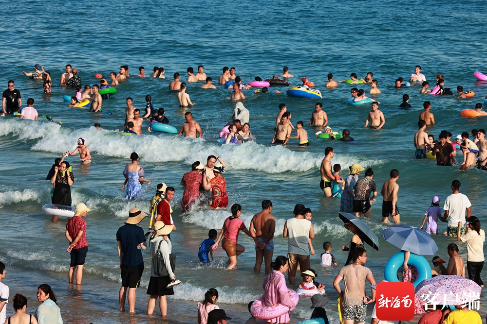 6月22日,眾多游客市民在三亞灣“洗龍水”。記者 沙曉峰 攝