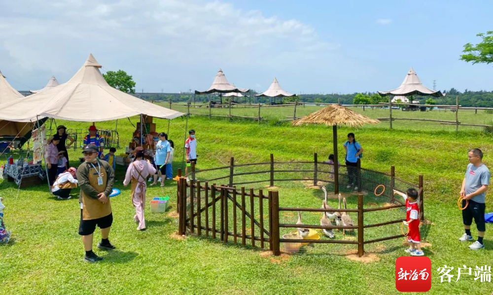 ??谑薪己谏酱逋?、南渡江畔,一塊延伸到江心的芳草沙洲,就是??谧钕然鹌饋淼穆稜I基地之一——北姆堆公園。這里有滿目嫩綠的草地,一頂頂天幕帳篷分布其間,供游客直接使用。這里也提供設備租賃,游客可以自行搭建。人們支起小桌子,鋪上野餐墊,彈琴、唱歌、拍照、享受美食,或是組隊玩飛盤、放風箏,好不自在;“兔子島”“柯爾鴨萌寵”等項目的加入,更讓北姆堆成為近郊親子游的人氣之選……
